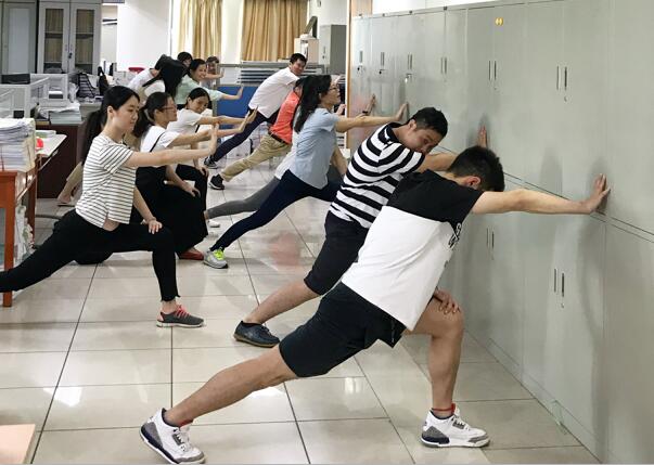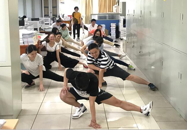 接着,支部举行首次“固定党日+”特色文化活动日——“一刻钟健身小学堂”活动。本次活动邀请新闻传播学院曾获“全国健美操锦标赛”亚军的严行同学,现场教学健美操的基础拉伸动作。短短的一刻钟,长期面对电脑伏案而作的教务处人员,一个动作一个动作地跟着做,左拉伸、右拉伸,左弓步、右弓步……健身课堂结束后,党员同志们感到身心愉悦,能以更饱满的精神状态投入到工作中。通过本次健身小课堂的良好反馈,党支部也决心进一步丰富支部的文化生活,营造更暖心的支部文化氛围,并充分利用课间操时间持续开展“一刻钟健身小学堂”活动,努力打造一支充满活力和干劲的党员队伍。