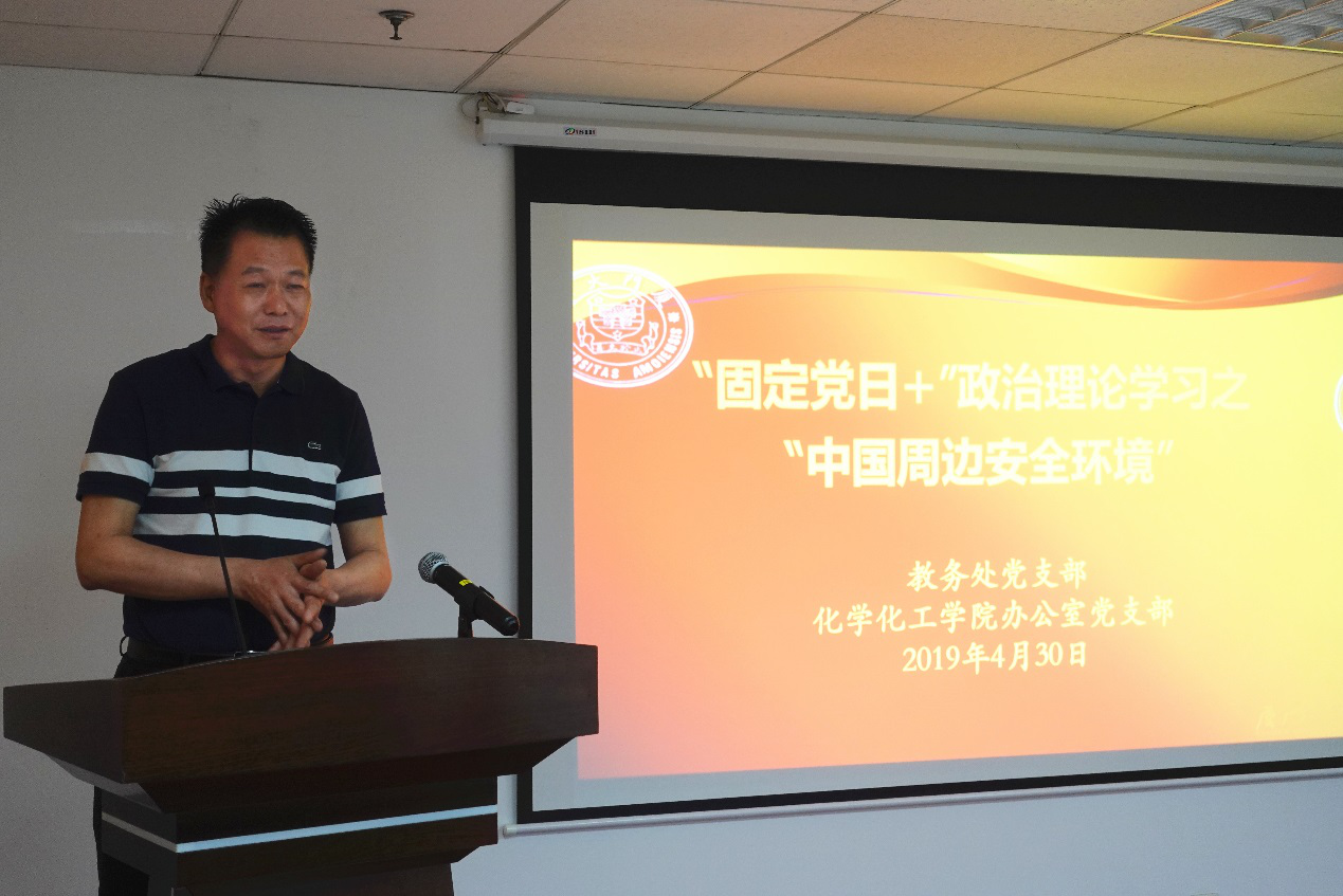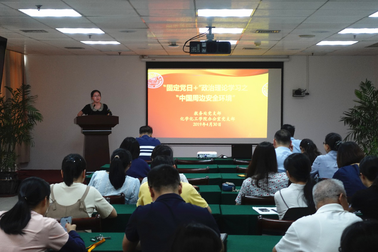 4月30日下午,教务处党支部联合共建支部——化学化工学院办公室党支部共同组织召开“固定党日+”政治理论学习,本次活动邀请军事教研室主任谢素蓉副教授做主题为“中国周边安全环境”的报告。报告会由教务处处长、党支部书记计国君主持。教务处副处长陈雪芬、黄艳萍,化学化工学院副院长张昌胜、办公室党支部书记林清育出席本次活动。两支部党员全程参与学习。