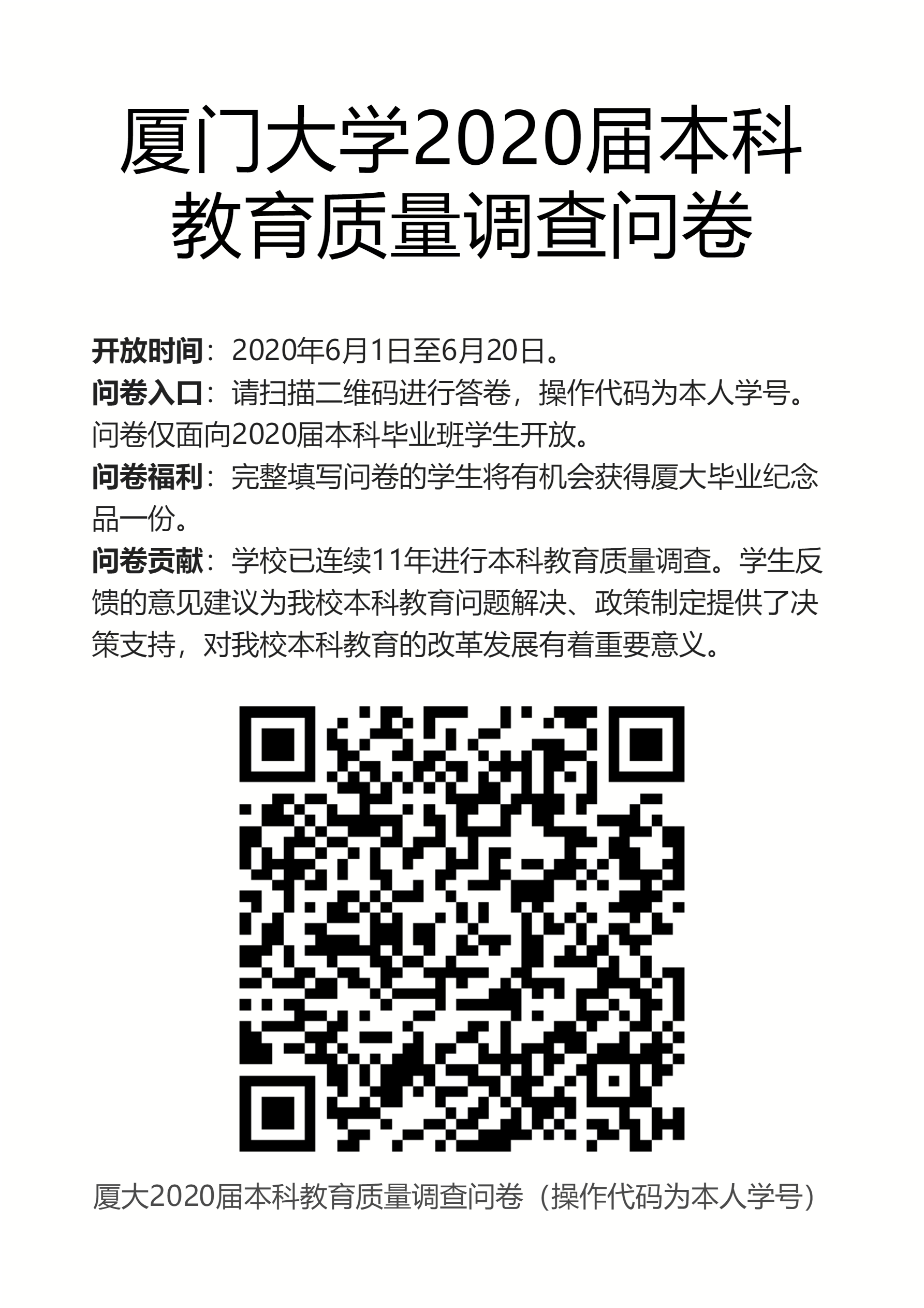 调查时间为202061日至620日。认真完整填写问卷的学生将有机会获得厦大毕业纪念品一份。问卷详见附件1