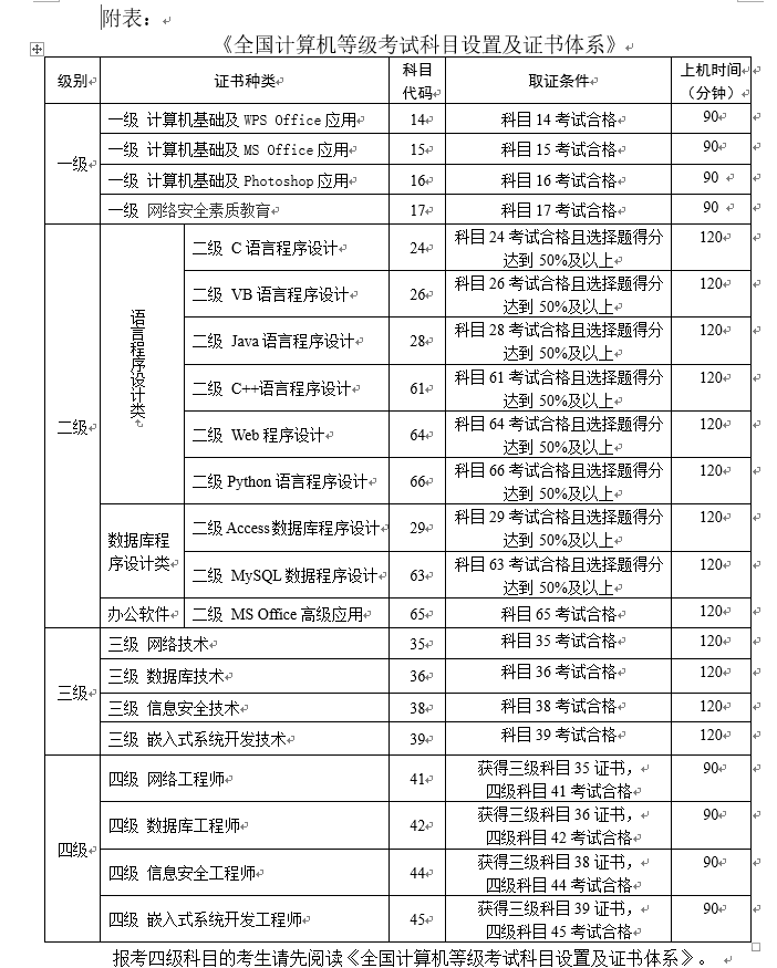 八、开考科目、代码、考试时长及取证条件,详见附表:
