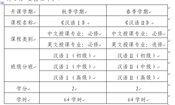 为适应国际学生不同程度的汉语学习需求,设置《汉语Ⅰ》《汉语Ⅱ》两门公共课程,并根据国际学生汉语水平,分初级、中级和高级三个级别进行教学(具体修读要求见附件5)。安排如下: