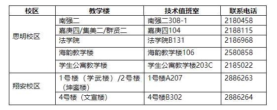 翔安校区:学武楼(1号楼)、坤銮楼(2号楼)、文宣楼(4号楼)教室