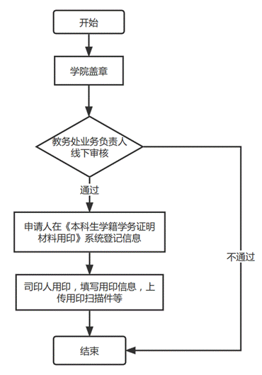 用印人提交材料给学院审核并签字盖章,经教务处业务经办人或教务处分管处领导签字审批同意后方可用印,用印申请人线上登记后,司印人用印,并填写用印信息,上传用印扫描件等,现场人工用印流程如下: