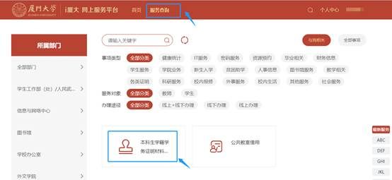为进一步规范教务处学籍学务业务专用章的管理,为在校学生和校友提供更好的用印服务,教务处学籍服务科依托“i厦大”服务平台推出学籍学务证明材料人工用印线上登记平台服务功能,并提供用印材料扫描件下载。用印服务指南如下: