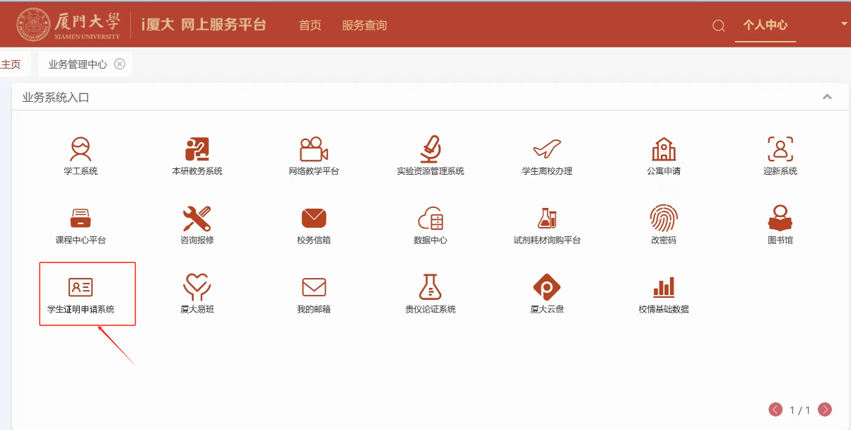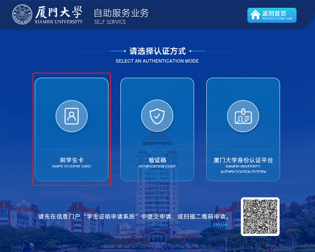 1.登录厦门大学信息门户(https://i.xmu.edu.cn/),在“业务系统入口”栏目下选择“学生证明申请系统”或用手机扫描以下二维码登录系统。