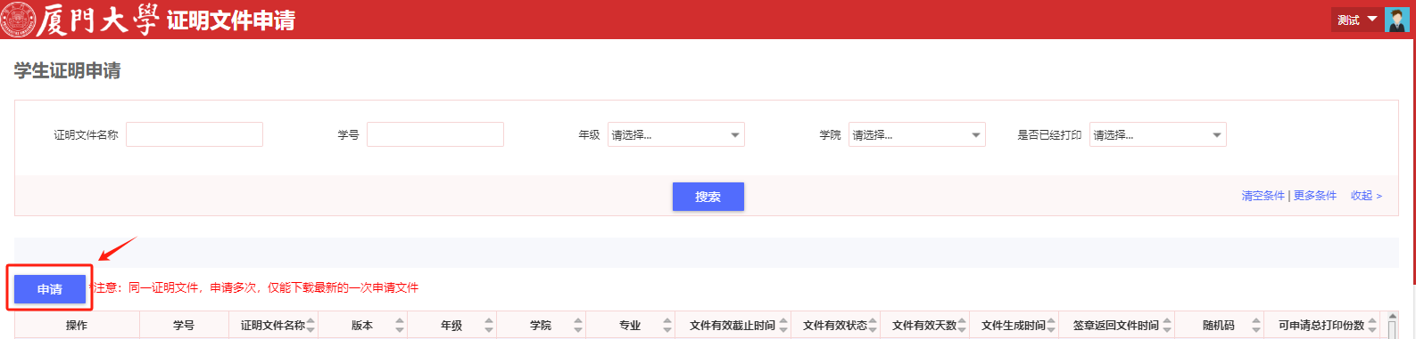 注:如果多次申请同一类证明文件,仅能下载、打印最近一次生成的证明材料。电子证明已加盖“厦门大学学籍学务专用章”电子印章,无需重复人工用印。