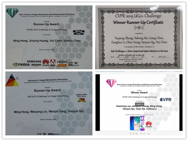 “曲老师不仅注重专业知识的普及,还培养学生爱国情操。同学们发表的多篇高质量科研论文、获得的多项高规格奖项都是教学效果的最好证明!”2019年参加计算机视觉顶会ICCV2019比赛获得二等奖的林雯颖、杨汶锦同学激动地说。由于曲延云在课程讲授中结合了科研热点和前沿技术,班级学生学习、科研热情空前高涨,有的同学发表了高水平的科研论文,有的同学在课程学习中或后期陆续参加国际国内计算机视觉相关的比赛,并获得优异的成绩。2018年选修本课程的吴桐同学、雷珍珍同学在CCF A类会议AAAI2020发表论文《Patch Proposal Network for Fast Semantic Segmentation of High-Resolution Images》,吴桐、戴必成两位同学在CCF A类会议IJCAI2020发表论文《Meta Segmentation Network for Ultra-Resolution Medical Images》,2019年张江涛同学以第二参赛人身份参加计算机视觉顶会CVPR 2020去摩尔纹比赛并荣获冠军,2019年陈淑鑫同学以第四参赛人身份参加计算机视觉顶会CVPR 2019图像去雾比赛获得二等奖……