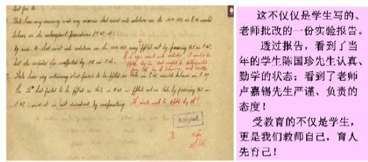 实验教学过程中,教师、助教处处率先垂范、身体力行,将课前搜集的珍贵史料结合要讲解的内容进行合理设计并适时有机嵌入实验原理、实验操作、废液回收操作以及对一年级学生如何写好实验报告等的讲解与示范过程中;有效引导、督促学生执行科学诚信承诺和安全责任承诺,达到润物无声的育人效果。如在讲评学生的实验报告时,顺势通过照片展示在1936年卢嘉锡先生(当年为助教)认真批改陈国珍先生(当年为本科生)的“分析化学实验”报告,卢先生的言传身教,鼓励学生学习化院老前辈严谨的治学和求学态度及精益求精的目标追求。同时,也告诫我们教师自己,要认真批改学生的实验报告,要履行好教师的一切职责,育人先育己。