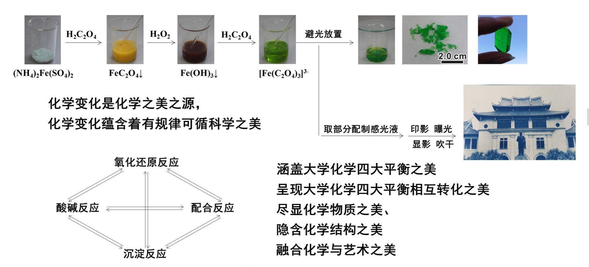 “三草酸合铁(III)酸钾的制备及其光化学性质”实验完美地融合了大学化学四大平衡及其相互转化理论知识的应用及晶体培养方法和操作技能的学习,以及其光化学性质的应用实践,并要求拍摄实验现象的照片和实验过程视频。通过实验及其课后讨论,让学生学习和了解常温下有关晶体(单晶)培养的一般方法及过程与条件和影响晶体生长的一些因素,并与自然界极端条件下(地下适宜的高温、高压、长时间的晶化)形成的天然晶体(如金刚石等)进行比较,让学生对晶体的性质和用途有更深入的认识。并通过提高拍摄实验照片或视频的要求和蓝晒印相工艺制作实践作品水平来提升学生的文化品位和审美情趣,融合了化学与艺术之美,贯穿了“美”的元素,“以美育人”。实现实验教学过程的知识传授、兴趣启蒙、能力培养与价值引领的有机统一。