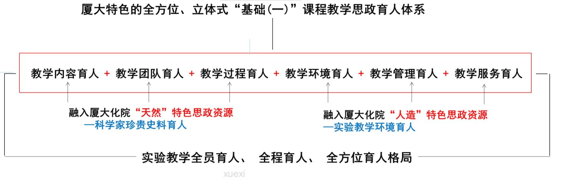 依托国家级一流化学实验课程构建全方位、立体式化学实验教学思政育人体系的特色之处就在于把厦大化院“天然”特色思政资源——科学家的珍贵史料以及厦大化院“人造”特色思政资源—— 良好实验教学环境与育人功能紧密联系,让学生在实验、实践、学习、交流于一体的实验教学过程中得到科学精神、安全意识、环保意识、审美意识与责任意识等全方位熏陶和培养。