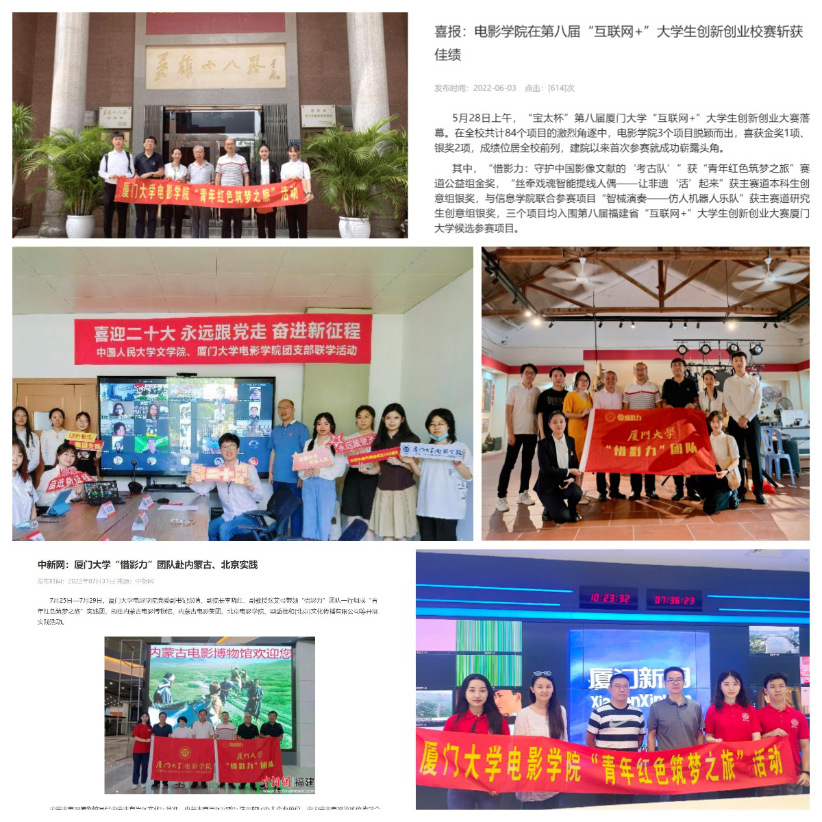 此外,学院开展“惜影力:守护中国影像文献的考古队”“寻访英雄的小八路”等青年红色筑梦之旅实践活动,走访厦门广播电视集团、中国电影资料馆安溪数字中心、福建广播影视集团等地开展实践调研,并参加“互联网+”“挑战杯”大学生创新创业大赛,双双斩获省赛金奖、成功晋级国赛;举办“喜迎二十大、永远跟党走、奋进新征程”主题活动,学院团委与中国人民大学文学院团委共建联学、联办微视频征集大赛,学院学子在学校主题征文活动摘得第一名、一等奖。学院积极组织党员编排生活情景剧、“追寻习近平总书记的足迹——闽山闽水物华新”暑期社会实践情景剧,思政教育初见成效。