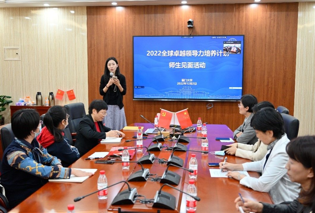 2022年12月2日晚,厦门大学2022全球卓越领导力培养计划(“卓越计划”)师生见面活动于思明校区顺利举行。美育与通识教育中心副主任兼教务处副处长楼红英、国际处副处长刘婉玉、外文学院副院长江桂英、公共卫生学院预防医学系副主任赵苒、新闻传播学院传播学系副教授罗慧、管理学院企业管理系助理教授刘斌、卓越计划教学课程组组长外文学院助理教授刘浩然,以及我校学生工作处、教务处、研究生院负责老师、2022卓越计划项目学生参加本次活动。