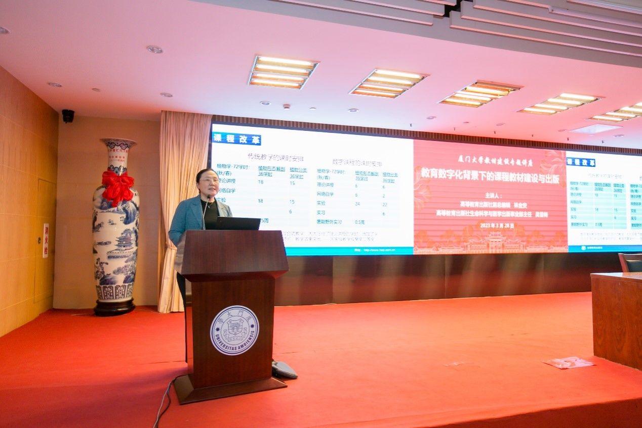 吴雪梅主任首先对首届全国教材建设奖进行总体分析,指出获奖教材具有团队优秀、持续修订、内容引领、形式创新、与头部出版社合作等特点,新形态教材、数字教材将是教材建设的发展趋势,将助力教材不断升级,以适应新时代高校教学模式变化。她强调,近年党和国家高度重视教材建设,先后出台了一系列政策文件,党的二十大报告也再次强调“加强教材建设和管理”,表明了教材建设国家事权的重要属性。各高校要充分认识加强新时代教材建设的重要性和紧迫性,准确把握教材建设的新形势新要求,着眼于“高质量”与“数字化”,积极推进教材建设,加强新形态教材的探索。高等教育出版社在多年纸质教材建设、数字化教学资源建设和在线开放课程建设的基础上,将继续大力推动以新形态教材、数字课程为代表的出版创新。随后,吴主任以数字课程教材《植物学2.0》《细胞生物学(第5版)》等首届全国教材建设奖获奖教材的建设历程为例,图文并茂、详细介绍了高等教育出版社在数字课程教材建设出版的探索实践,并对高校及教师在教育数字化战略背景下如何加强建设优质的新形态教材和数字课程教材提出宝贵建议。