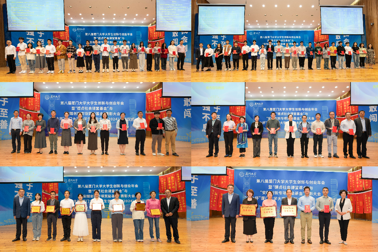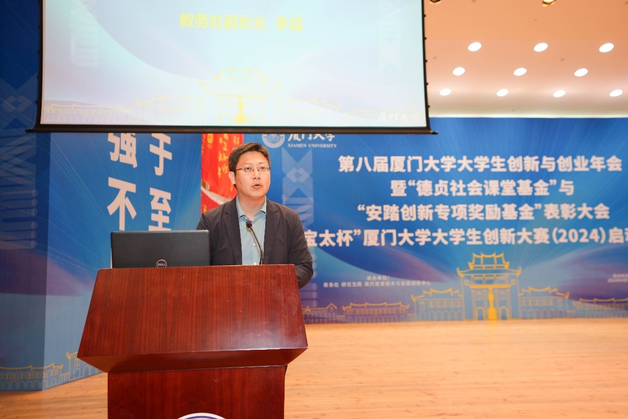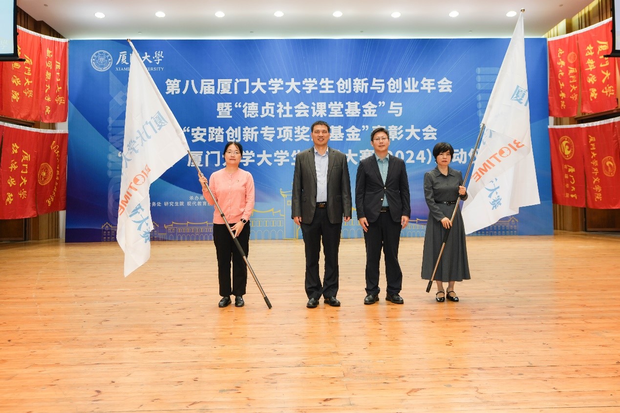 4月11日,学校在科学艺术中心举行第八届厦门大学大学生创新年会暨“德贞社会课堂基金”与“安踏创新专项奖励基金”表彰大会、“宝太杯”厦门大学大学生创新大赛(2024)启动仪式。副校长方颖,德贞社会课堂基金捐赠人、77级校友朱德贞, 宝太生物基金捐赠人、94级校友黄建国等出席大会。